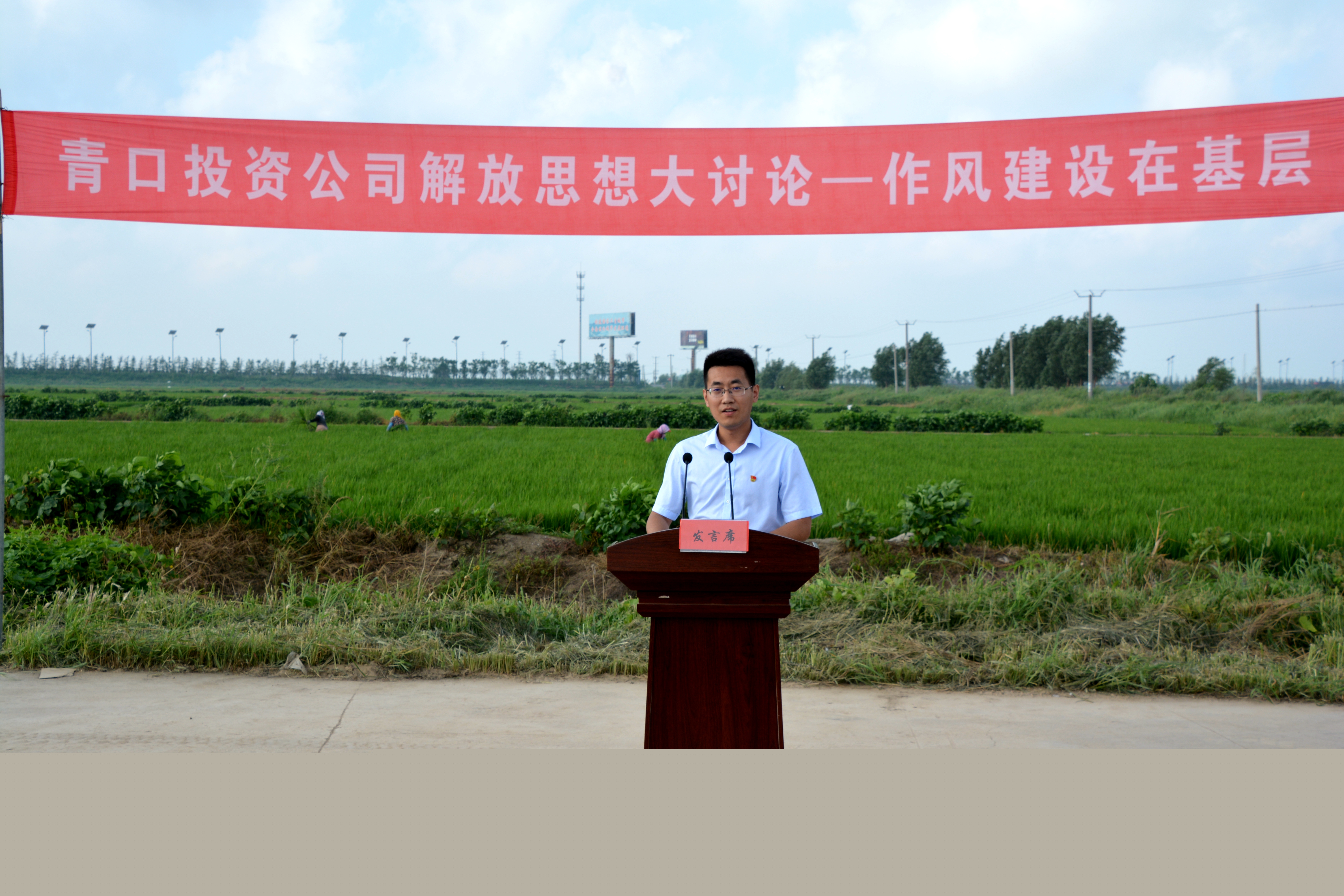 八月盛夏,高溫持續。清晨五點多,旭日剛剛升起,青口投資公司萬畝“鹽稻”在陽光照耀下美如畫卷,該公司大新農場田頭已經沸騰起來了。只見橫幅早已高高掛起,人員也悉數進場,不時傳來調試音響的聲音,一場接地氣的“作風建設在基層”論壇就在這里拉開帷幕,八十余名干部職工在藍天白云下感受了這場別開生面的“田頭論壇”。