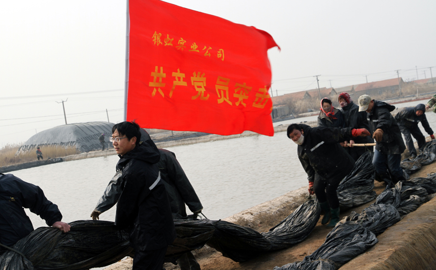 1116,一面紅色的黨員志愿者服務(wù)隊(duì)隊(duì)旗在陽(yáng)光下飄展,在一片雪白結(jié)晶池埝的映襯下,顯得格外鮮艷。徐圩投資公司深港服務(wù)區(qū)12名黨員志愿者頂著寒冷的晨風(fēng),緊忙趕往新灘服務(wù)區(qū)原料鹽基地建設(shè)現(xiàn)場(chǎng),幫助其12個(gè)單元搶裝池埝土工布,也為這個(gè)冬天添加幾許新鮮的氣息。