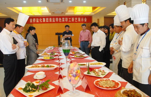 5月19日上午,金橋鹽化集團(tuán)淮鹽特色菜職工廚藝展示會(huì)在淮鹽大酒店隆重舉辦。公司黨委副書記、紀(jì)委書記、工會(huì)主席盧明生致歡迎詞,集團(tuán)公司工會(huì)副主席李嵐芹宣布比賽開(kāi)始。來(lái)自集團(tuán)公司各基層單位的13名技藝精湛的廚師做出了26道特色佳肴,經(jīng)過(guò)評(píng)委會(huì)認(rèn)真品評(píng),臺(tái)南鹽場(chǎng)王樹偉、青口鹽場(chǎng)盧燕獲一等獎(jiǎng),其他選手分獲二、三等獎(jiǎng)。(司宣)