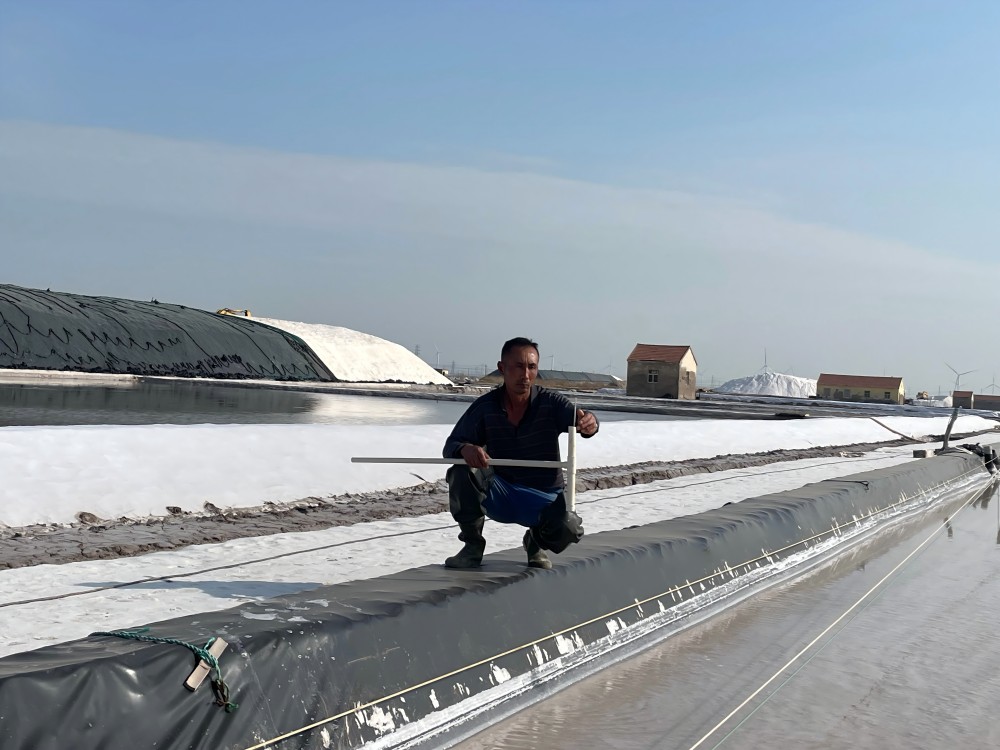 鹽工們的日常,是與陽光、礦鹵和鹽灘的對話。清晨,他們早早來到鹽灘,檢查鹵水深度和濃度,各節(jié)制、池埝是否滲漏;下午,頂著烈日觀察礦鹵蒸發(fā)狀態(tài);傍晚,仔細查看鹽粒結晶情況。遇到極端天氣,全員出動,爭分奪秒為鹽堆苫蓋防護布。“雖然辛苦,但看到像小山一樣的鹽堆,就覺得一切都值了。”年輕的鹽工小陳擦著汗笑道。