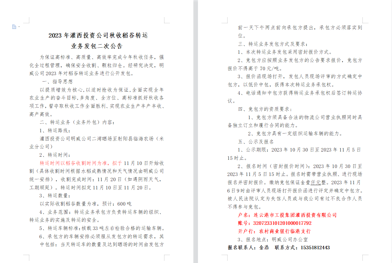 2023年灌西投資公司秋收稻谷轉運 業務發包二次公告