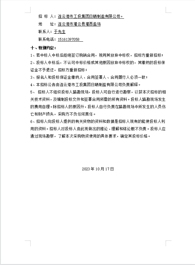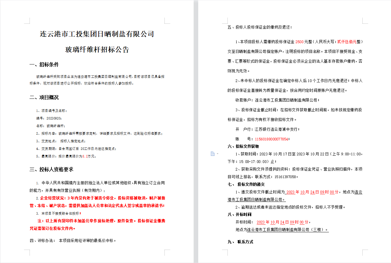 連云港市工投集團日曬制鹽有限公司玻璃纖維桿招標公告