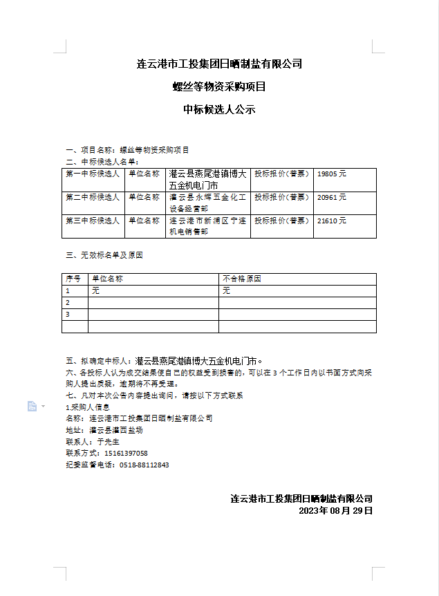 連云港市工投集團日曬制鹽有限公司螺絲等物資采購項目中標候選人公示