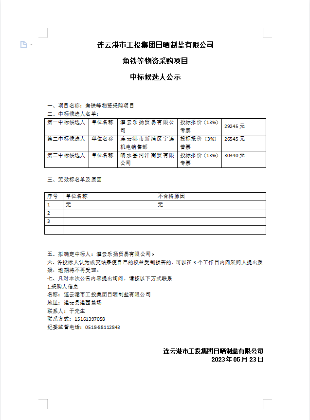 連云港市工投集團日曬制鹽有限公司角鐵等物資采購項目中標(biāo)候選人公示