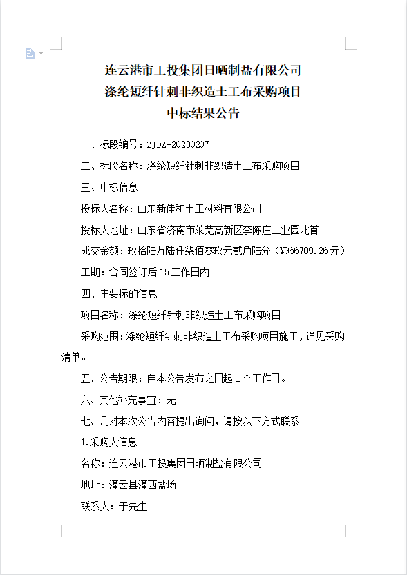連云港市工投集團(tuán)日曬制鹽有限公司滌綸短纖針刺非織造土工布采購(gòu)項(xiàng)目中標(biāo)結(jié)果公告