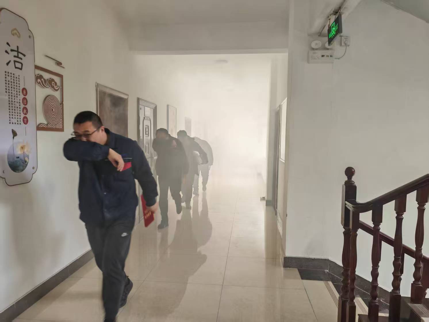 疏散演習開始后,全體人員迅速做出反應,在現場引導員的指揮下,按照預定的疏散路線,捂住口鼻,低姿彎腰,有序地向指定的安全區域撤離。