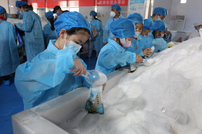 小朋友們首先參觀了包裝鹽車(chē)間生產(chǎn)線,對(duì)制鹽過(guò)程有了直觀的認(rèn)識(shí),接著來(lái)到雪花鹽車(chē)間體驗(yàn)手工包裝,提升參與感、獲得感。此次參觀體驗(yàn)活動(dòng),讓小朋友近距離感受家鄉(xiāng)的淮鹽魅力,很好的傳承了淮鹽文化。我公司作為省級(jí)文明單位,近年來(lái),積極履行社會(huì)責(zé)任,多次與灌南縣尹蕩村、連云區(qū)大竹園村等單位開(kāi)展文明共建,爭(zhēng)做文明使者,彰顯國(guó)企擔(dān)當(dāng)。(金宣)
