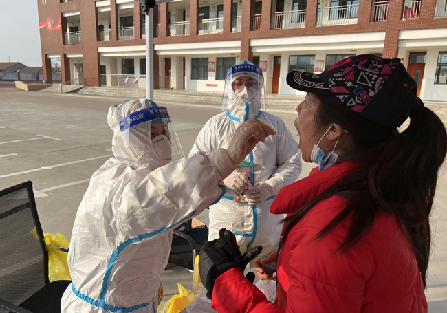 圖為黨員霍晶協(xié)助醫(yī)務(wù)人員對居民進(jìn)行核酸采樣