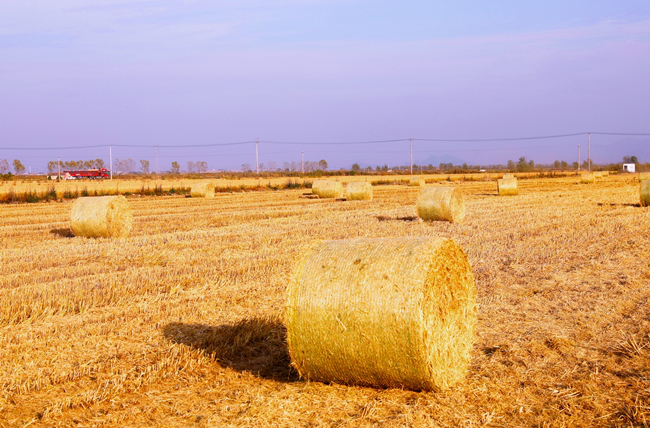 (摟草機和秸稈打包機正在地里作業)