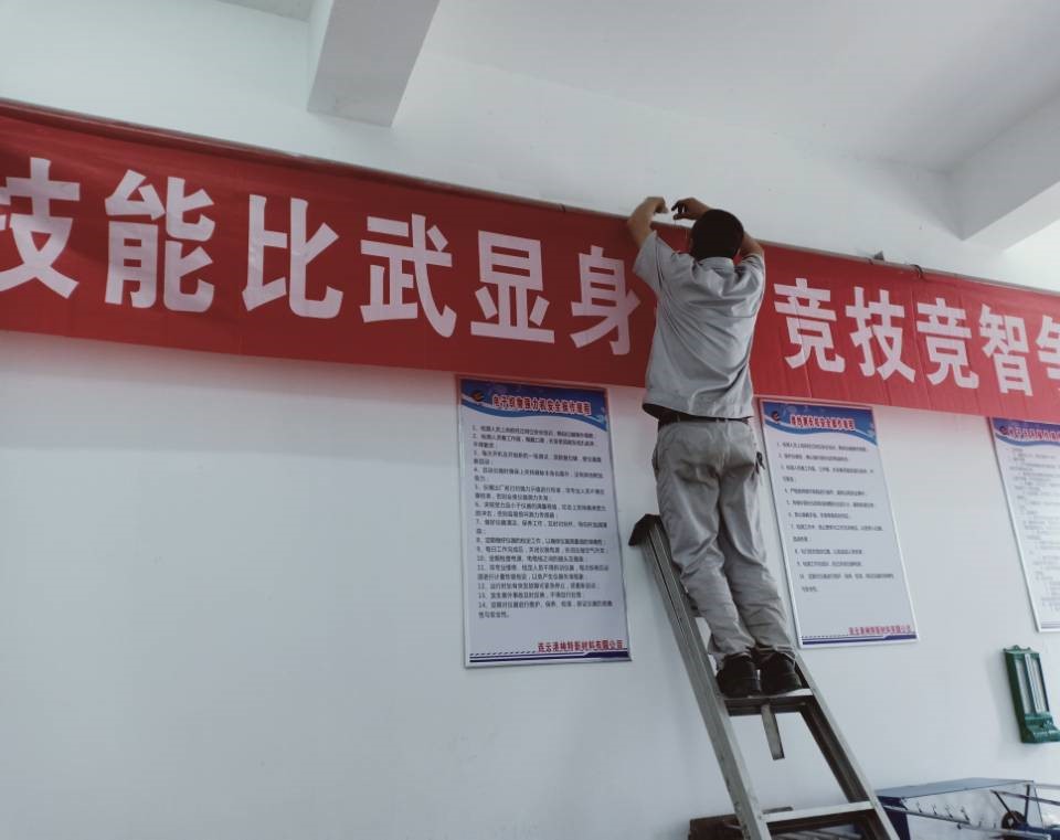 ? ? ? ? ??為營造技能大賽氛圍,7月7日上午,品質(zhì)管理部特地請維修組件班組朱師傅、王師傅在品質(zhì)管理部辦公區(qū)掛上宣傳橫幅。維修組件班組的兩位師傅不怕麻煩,多次調(diào)整橫幅的角度,力求做到盡善盡美,為營造技能大賽氛圍貢獻自己的力量。