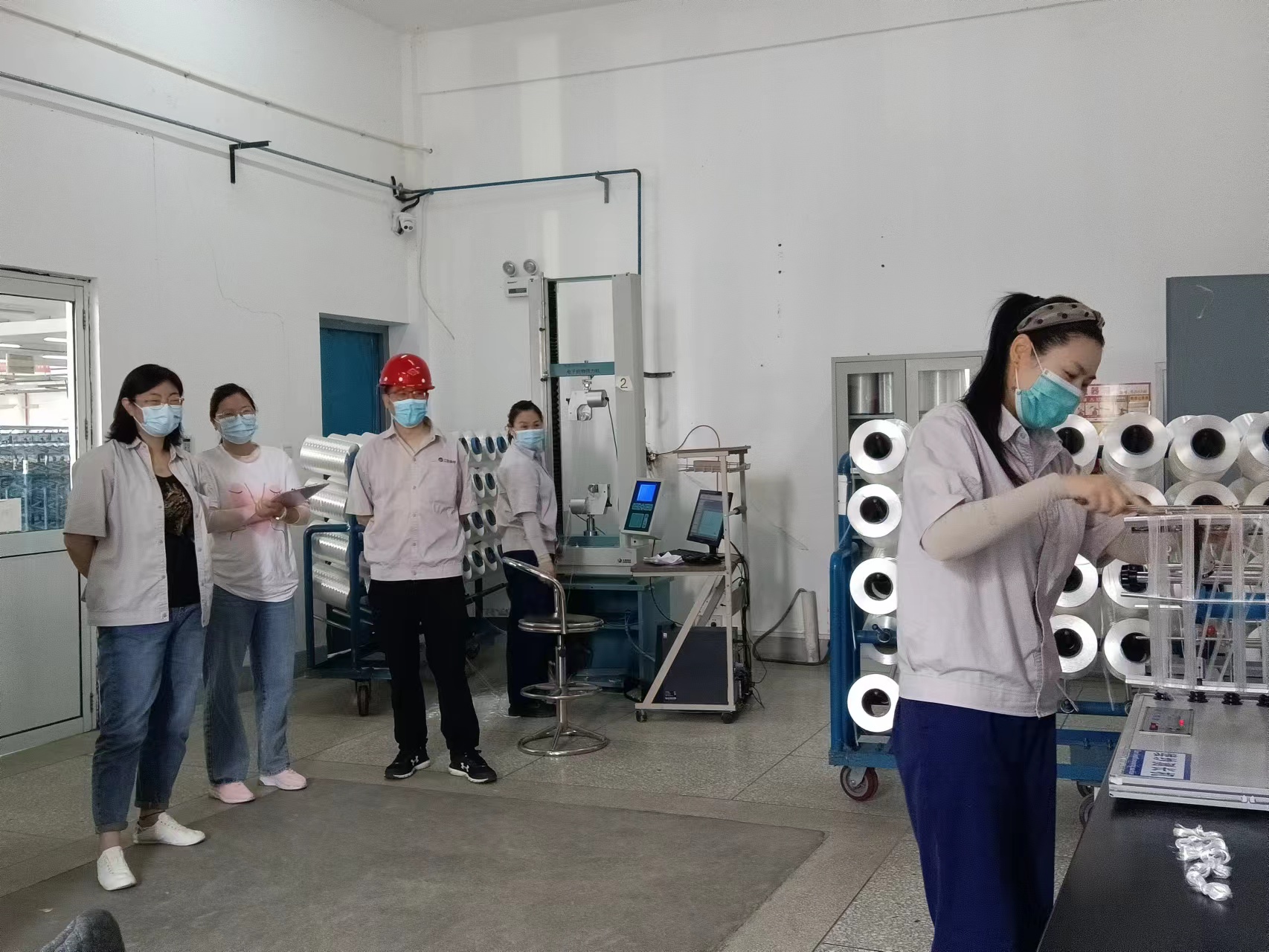 上午930,物檢班組緊接著開始比賽。纖度檢測首先上場的是王玉梅同志,掛絲、繞絲、打結、稱重有條不紊的完成了比賽。強度檢測比賽中侯義芹同志第一個出場,以幾乎完美的表現完成了比賽。經過激烈的角逐,王娟同志以41005獲得了纖度檢測第一名,侯義芹同志15114獲得強度檢測第一名 。