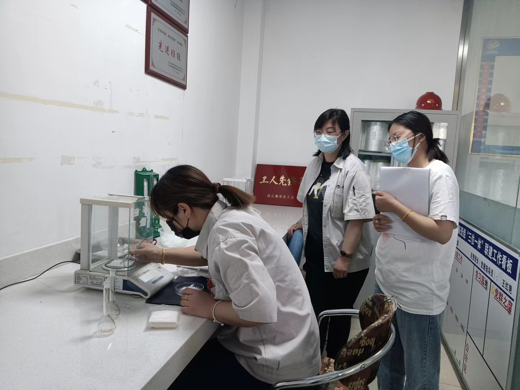 526日上午9點,化驗班組準時開始比賽,選手們聚精會神的調整天平水平、置零、稱量蠟紙、置零、再稱量凍膠絲、放入容量瓶,一套操作如行云流水般一氣呵成。最終,吳珊珊同志在非常接近的比分中以25386險勝!