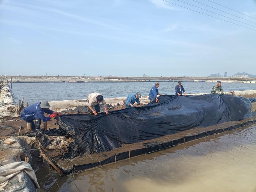 為了盡快完成海濱鈣液儲備池改造,5月3日,礦鹽班組、鈣液班組人員全員集聚到海濱鈣液灘,把舊塑布進行回收安置,同時對鈣液輸送管道進行細致的檢查,發(fā)現(xiàn)需要維修的接口及時維修,確保鈣液儲備池能夠順利完成改造。此次海濱鈣液池的改造可以存儲1.5萬方,同時也可以盡快退出鈣液生產(chǎn)用地,進行改造養(yǎng)殖池塘,為公司增加收入。