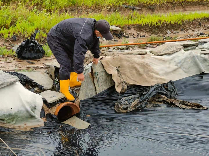 為了確保養(yǎng)殖池塘的安穩(wěn)度訊,養(yǎng)殖辦工作人員頂著大雨查看池塘水位和圍堰抗臺風(fēng)情況.