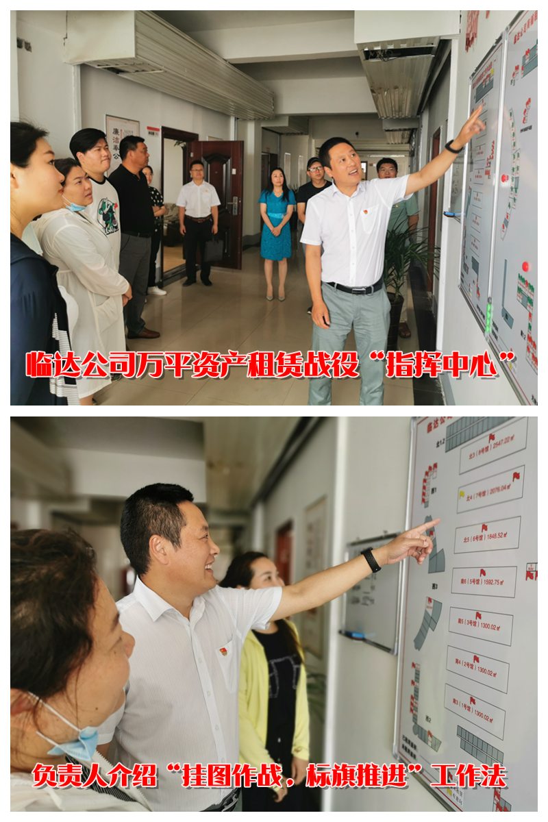 “分解任務(wù),每天出租180平方,我們用掛圖作戰(zhàn)工作方法,在困難中找優(yōu)勢(shì),在優(yōu)勢(shì)中找方法,將集中資產(chǎn)劃分片區(qū),分而治之,實(shí)行一個(gè)片區(qū)一個(gè)目標(biāo)導(dǎo)向,一個(gè)片區(qū)一個(gè)工作方法”“臨鋒而行,達(dá)道致遠(yuǎn),這是臨達(dá)公司的立企宗旨,我們是這么喊,也是這么干的”“臨達(dá)的年輕同志們是我們能夠突破7200平方任務(wù)的秘密武器,他們上門(mén)商談至天黑,周六周日讓他們休息都不休息,依然堅(jiān)守崗位跑市場(chǎng)”在臨達(dá)公司的“作戰(zhàn)指揮中心”,聽(tīng)取負(fù)責(zé)人杜洪波的介紹后,參加采風(fēng)的同志都忍不住豎起大拇指為先拔頭籌,超額超時(shí)完成任務(wù)的臨達(dá)全體“指戰(zhàn)員”點(diǎn)了個(gè)贊。