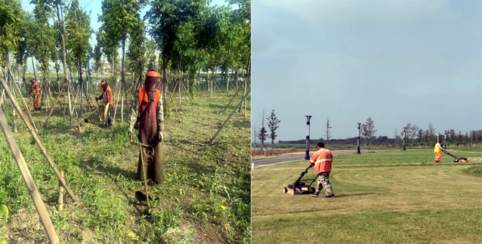 早上6:30,班組兵分三路。班長田恒亮帶領一組工人用草坪機修理草坪;協管員葛成東帶另一組工人用割灌機清除雜草;對于不便用機器清除的區域,第三組工作人員采取用手拔除方法,確保各區域雜草清理不留死角。