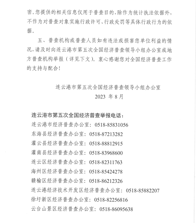 按照《全國經(jīng)濟普查條例》規(guī)定,國務院決定于2023年開展第五次全國經(jīng)濟普查,為提高經(jīng)濟普查質(zhì)量,進一步推進普查工作順利開展,公司按照上級第五次全國經(jīng)濟普查宣傳動員工作要求,現(xiàn)將《連云港市第五次全國經(jīng)濟普查單位告知書》公示如下: